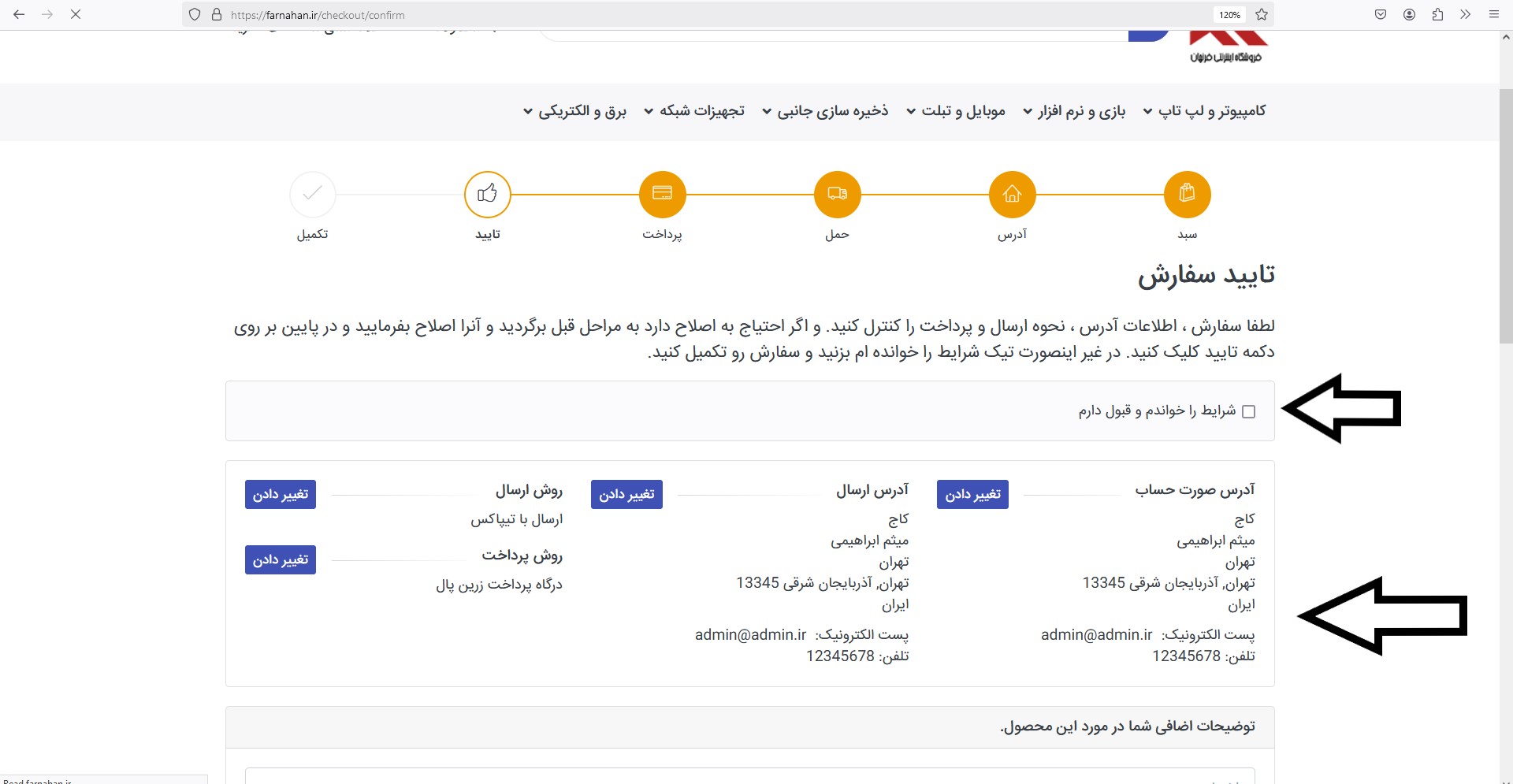 در این قسمت شما میتوانید آدرس ارسال فاکتور و ارسال کالا و همچنین روش ارسال و روش پرداخت را تغییر دهید در غیر اینصورت گزینه شرایط را خوانده ام کلیک کرده و در پایین صفحه گزینه تایید را انتخاب کنید .