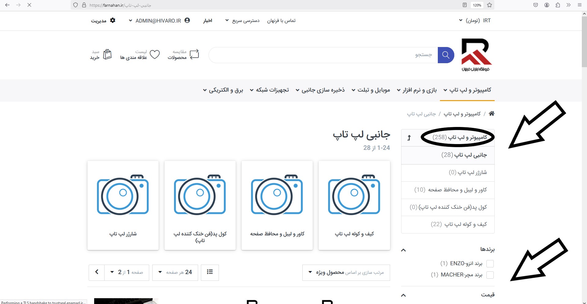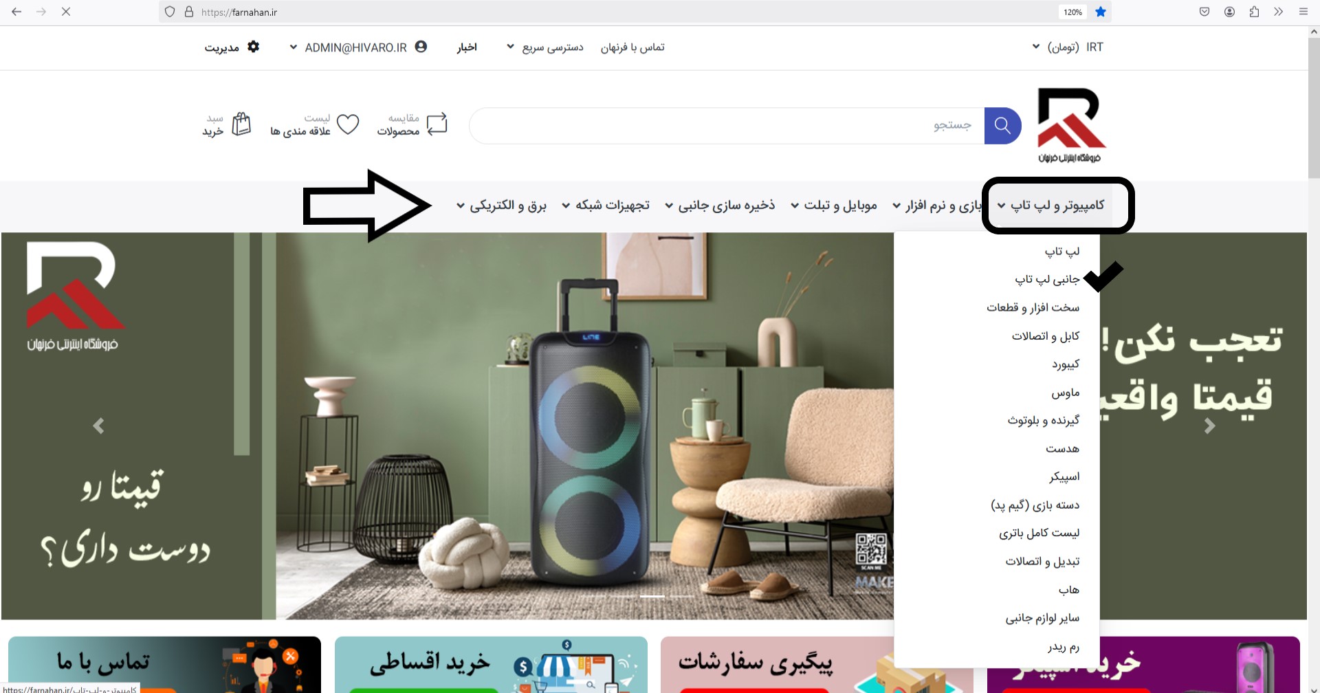 در ادامه همانطور که در عکس زیر مشاهده میکنید در بالای صفحه دسته بندی های سایت موجود است ، بطور مثال در قسمت کامپیوتر روی دسته بندی جانبی لپ تاپ کلیک میکنیم.