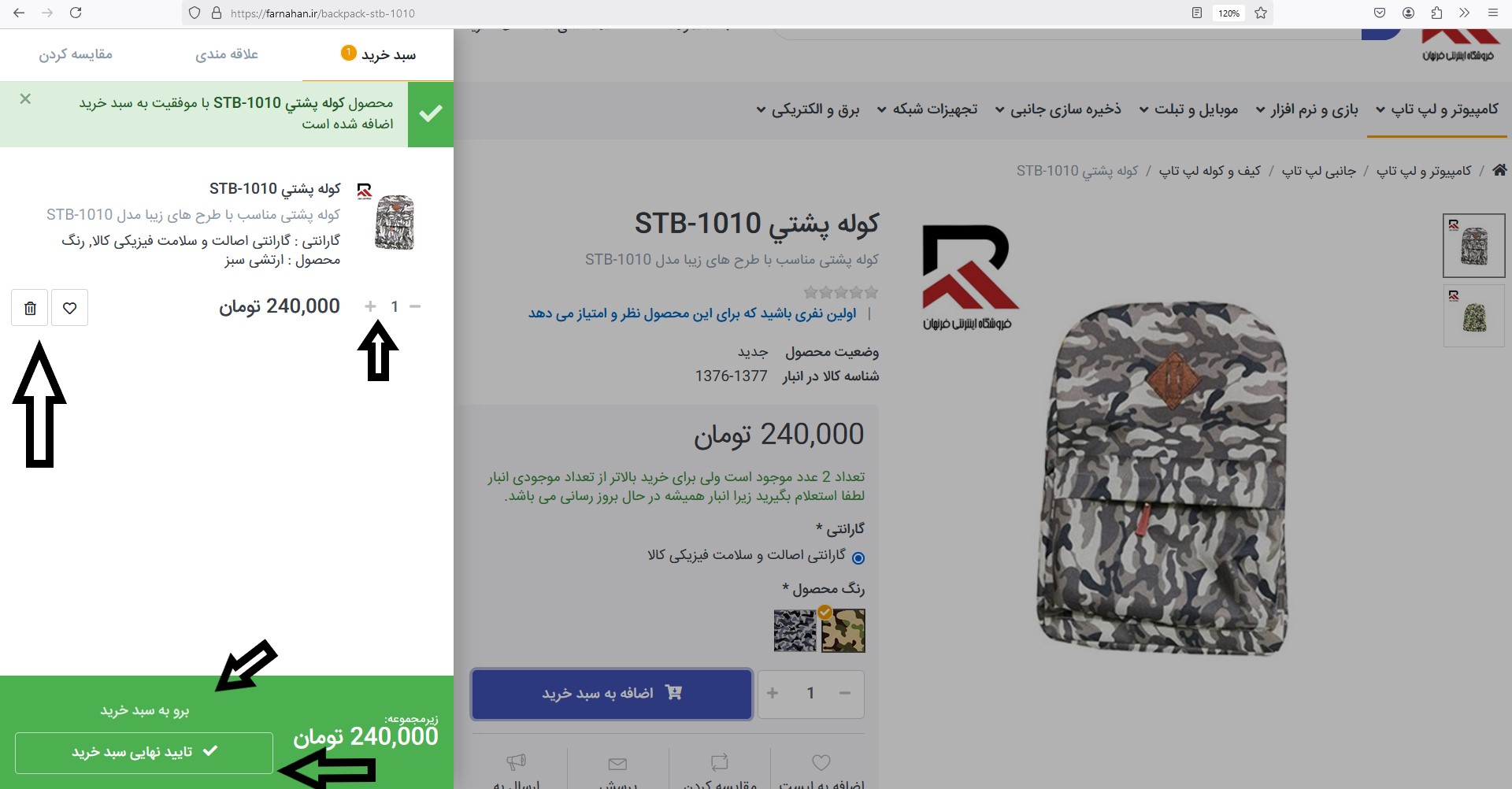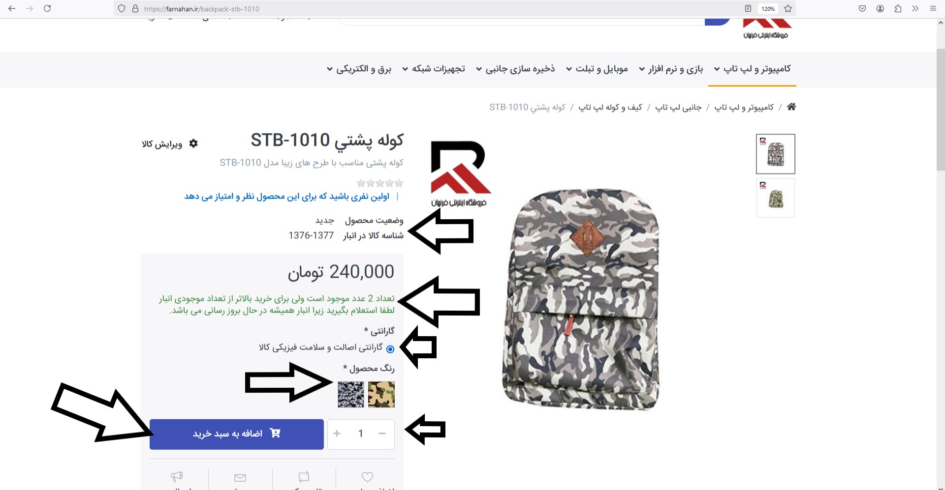 بعنوان مثال در دسته بندی جانبی لپ تاپ محصول کوله پشتی رو انتخاب میکنیم و صفحه محصول بالا میاد . در این بخش شما چندتا گزینه بسته به نوع محصول مشاهده میکنید اعم از :گارانتی - رنگ محصول - قیمت نهایی - شناسه محصول - تعداد و... در برخی موارد تیک از پیش خورده در برخی هم نیاز به انتخاب شماست مثلا هدست فقط رنگ مشکی موجود، خود سایت تیک رنگ مشکی رو فعال کرده اگر دو رنگ بود انتخاب را بر عهده خود شما میگذاشت.