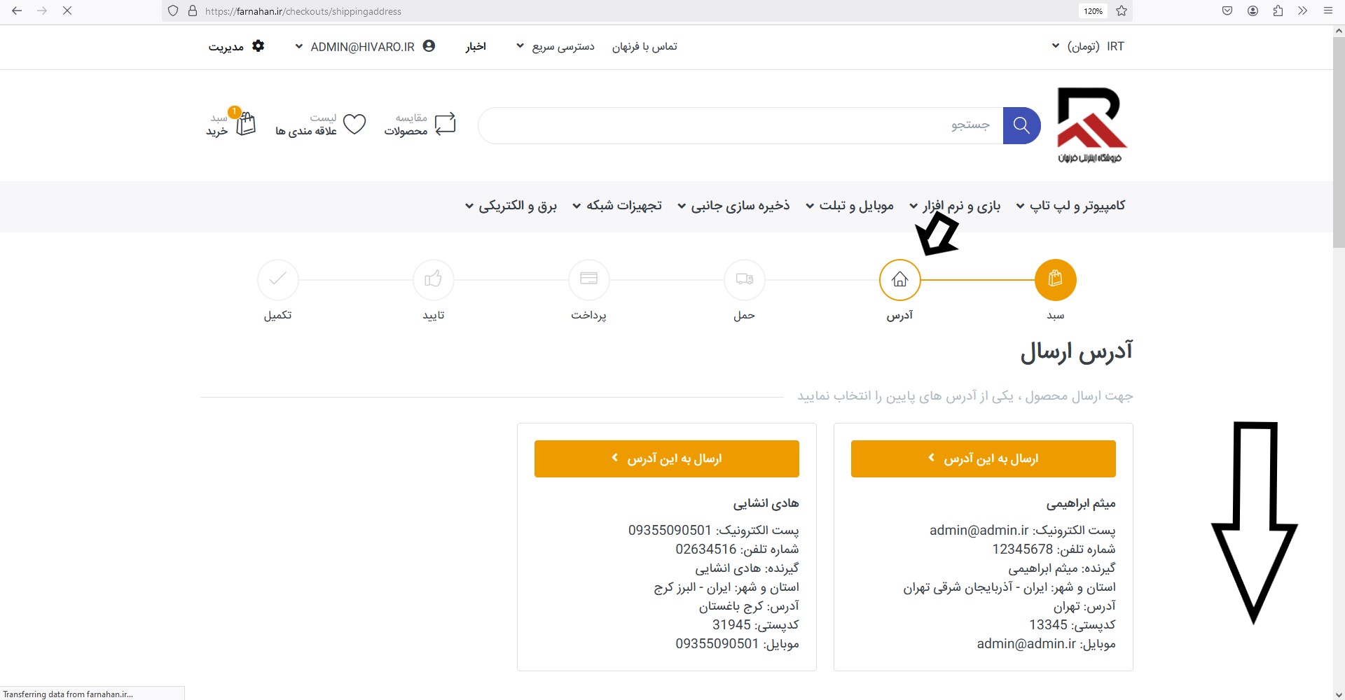 اگر در هنگام ثبت نام اولیه حساب کاربری خود رو تکمیل میکردید در این قسمت از شما سوال میشد که قصد دارید به همان آدرس محصول ارسال شود یا قصد دارید برای آدرس دیگری ارسال شود این مناسب دوستانی است که قصد دارند محصول به آدرس دیگر ارسال شود بدون فاکتور مثلا کادو دادن
