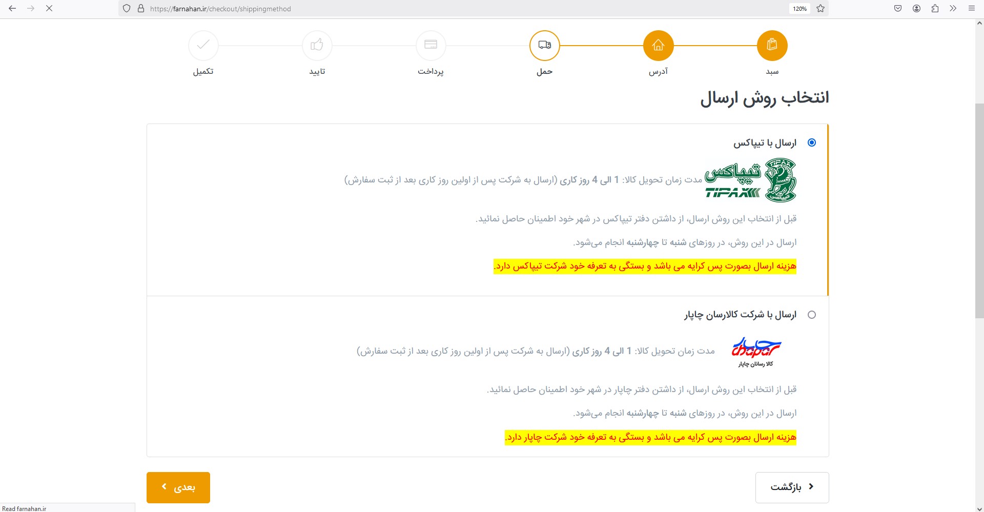 در ادامه بعد از پر کردن فیلد های مشخص وارد قسمت حمل می شوید که در هر قسمت کامل توضیحات هزینه و نوع روش ارسال موجود ، برای انتخاب صریح تر شما بوده .
